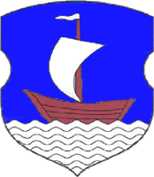 голубом поле барочного щита ладьи натурального цвета с распущенным парусом на