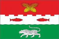 красного цвета; в центре красной полосы – две жёлтые кедровые шишки с веточками,
