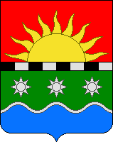 В верхней части щита выходящее золотое солнце с пламеневидными лучами, в нижней