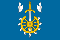 2:3, по центру которого помещено изображение фигур из герба (меч, колесо и