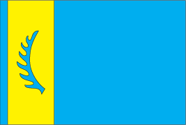 Дата принятия: Утверждён 10 сентября 2004 года. Описание: "Прямоугольное полотнище с соотношением сторон 2:3 состоит из трёх вертикальных полос голубого, жёлтого и голубого цветов (1:6:17). В центре жёлтой полосы голубой рог оленя". Источники.