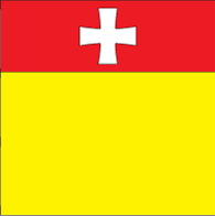 равно 1:2), посредине верхней полосы - белый лапчатый крест".