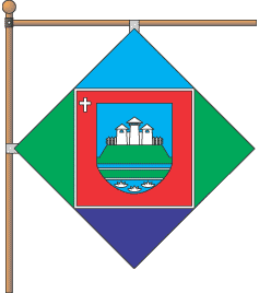 углу - белый крест; верхний треугольник знамени голубой, нижній - синий, по
