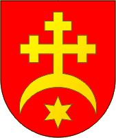 Дата принятия: Исторический герб Лукова 1575 года. Описание: "В червлёном поле золотой полумесяц рогами вниз. Под ним золотая шестилучевая звезда, а над полумесяцем крест с перекрещенными концами". Источники. Статьи К. Богатова.