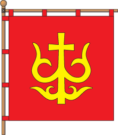 Дата принятия: неизвестна, но не позднее 2010 года. Описание: "Квадратное полотнище с соотношением сторон 1:1 красного цвета с изображением Трезубца князя Святополка". Источники.