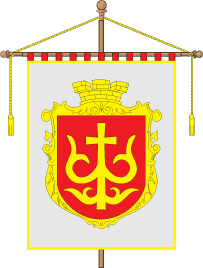 3:2 белого цвета с изображением герба города - Трезубца князя